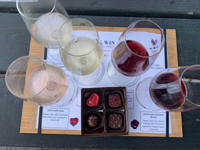 Open since 1978, Lenz Winery is one of the oldest vineyards on the North Fork. The massive estate spans 70 acres, including its adorable outdoor tasting room of about a dozen picnic tables. They’re equipped with umbrellas to keep you cool in the summer, as well as heat lamps to keep you warm in the late spring/early fall. Lenz has four different wine flights to choose from, but the best, in my opinion, is the chocolate pairing. It comes with five wines and four chocolates: one sparkling wine which stands alone, and two whites and two reds paired with various sweets from the North Fork Chocolate Company. While wine and cheese pairings are fairly common, this is the first time I’ve seen a chocolate pairing offered and it was absolutely fantastic.